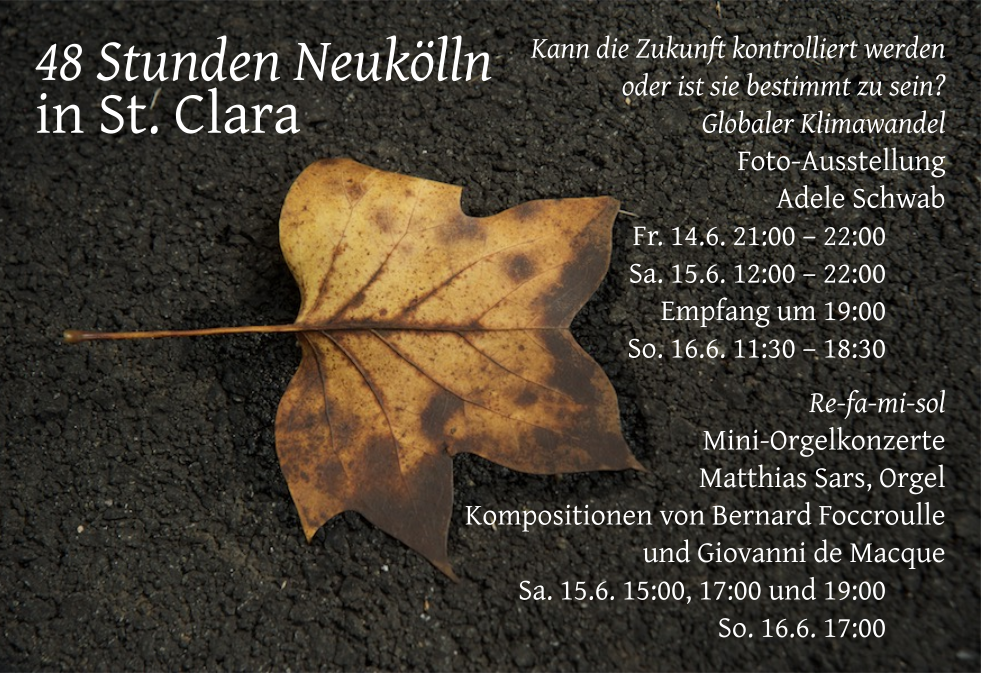 Saturday, 7 September 2019, 18:00 Pfarrhof St. Clara Eingang Kienitzer Straße 18 Berlin-Neukölln |